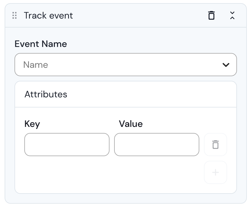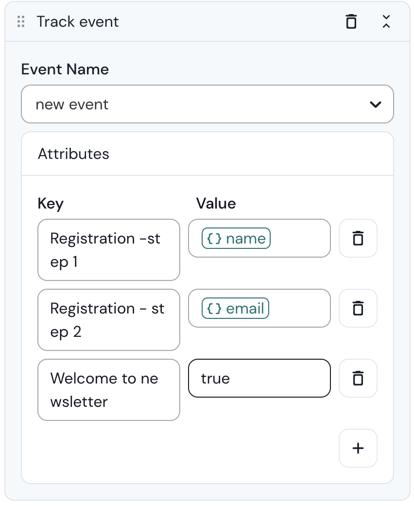 7. Back to your block now. Define the attributes that will be saved with this event. Attributes are pairs of keys and values which are not mandatory, but will enrich your data. Their values can be hardcoded information or variables that you gathered previously in your flow.