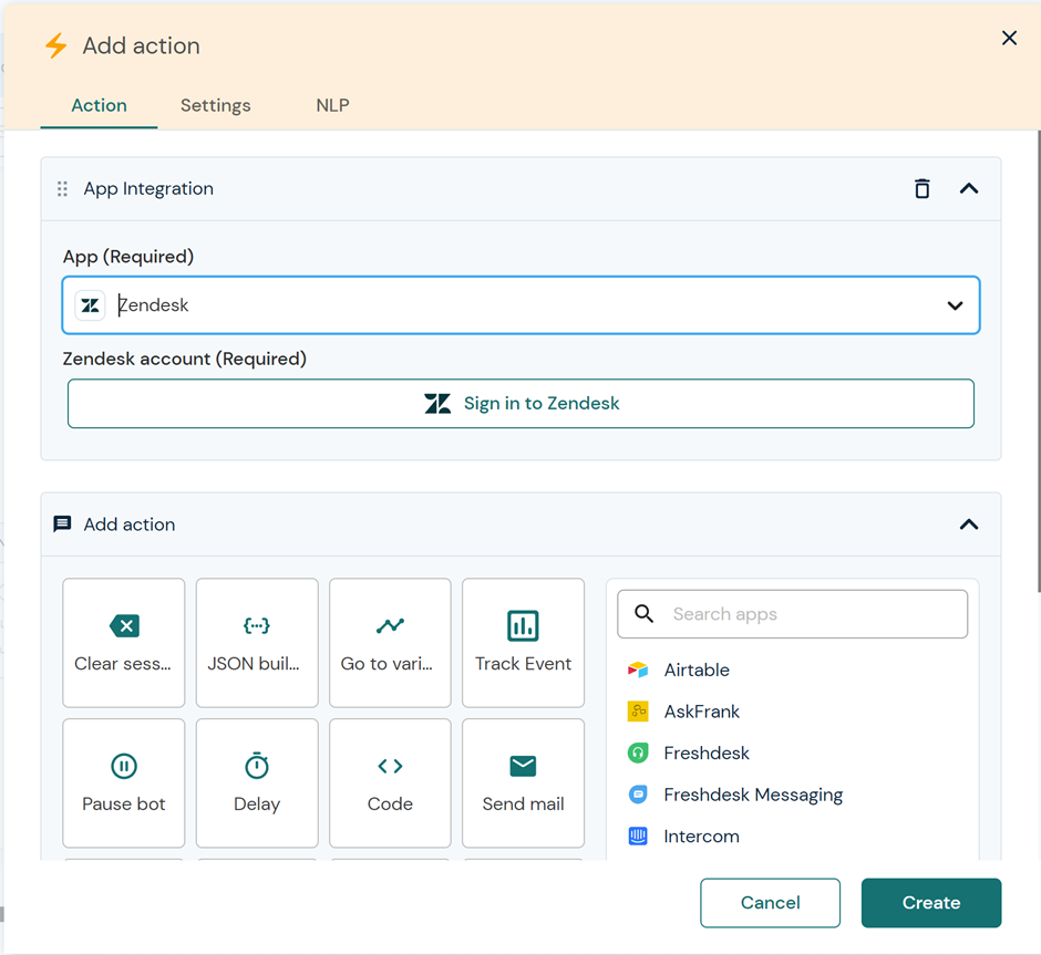 Você pode conectar sua conta Zendesk a partir de um bloco de Ação: