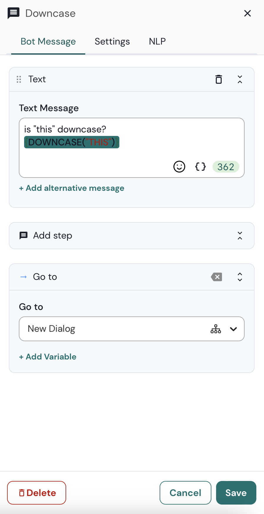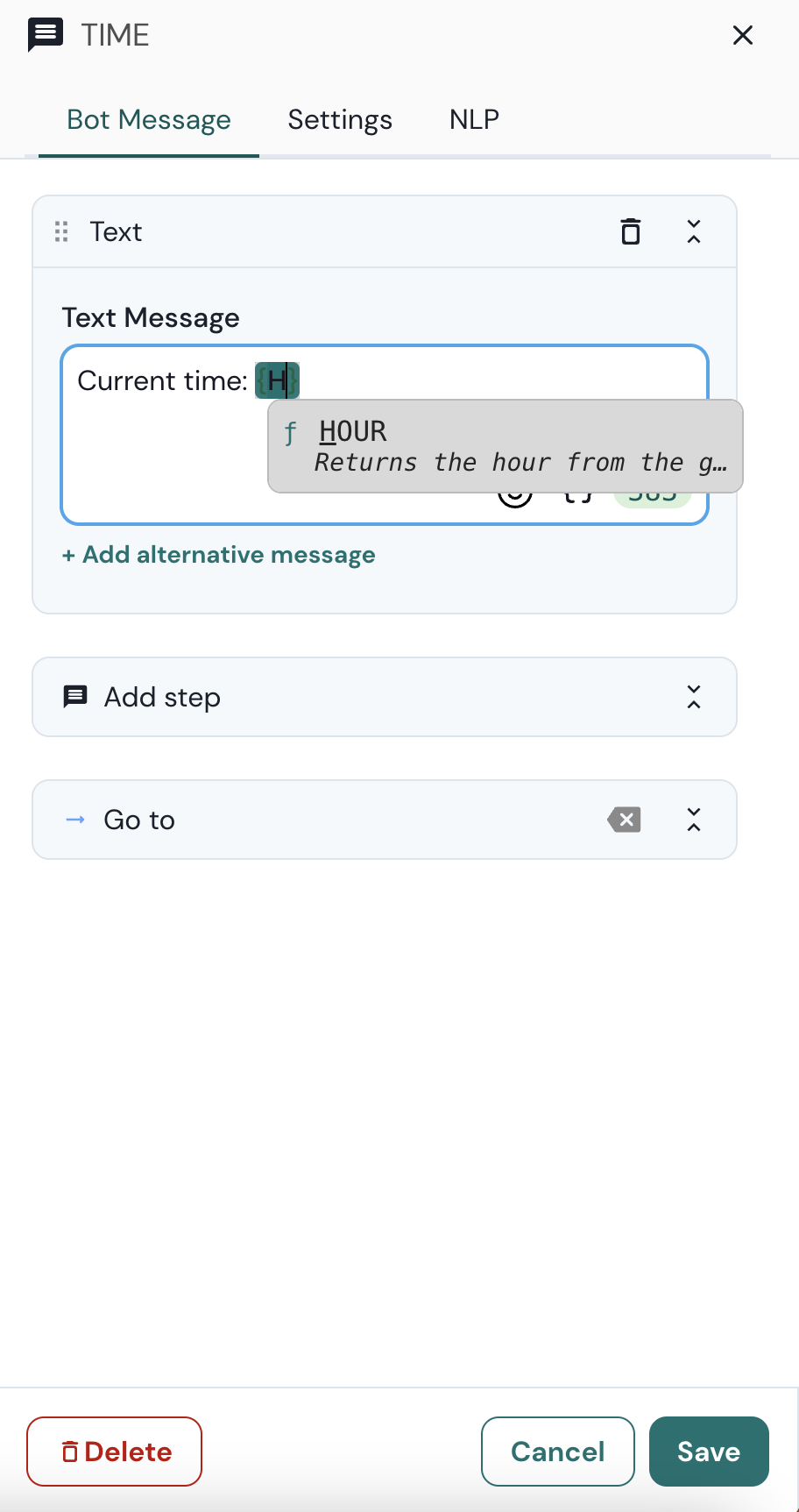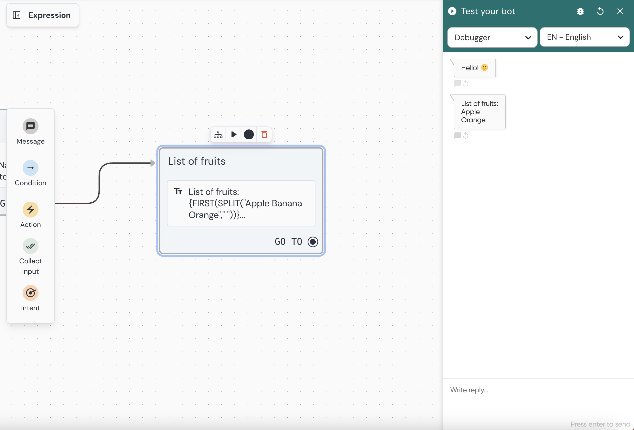 Use a sintaxe de expressão dentro de um passo de texto para exibir o resultado dentro da mensagem do seu bot.