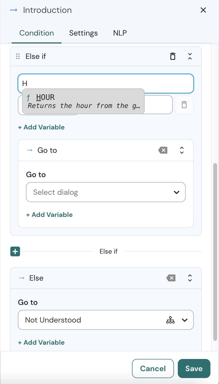 Use a sintaxe de expressão dentro de uma [bloco de Condição](https://docs.chatlayer.ai/chatlayer-documentation-pt-br/buildabot/flow-logic/dialog-state/plugins) declaração como um [variável](https://docs.chatlayer.ai/chatlayer-documentation-pt-br/navegacao/settings/secure-variables-gdpr).