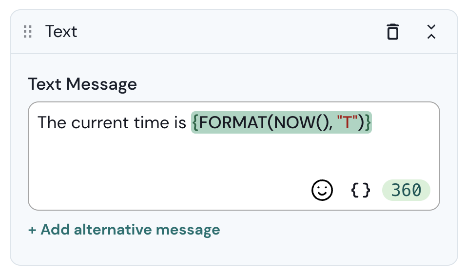 <figure><img src="https://181262846-files.gitbook.io/~/files/v0/b/gitbook-x-prod.appspot.com/o/spaces%2F-LLTwFwbOqJj4dDhg8Ju%2Fuploads%2Fglldzoi45FWG8tJXeQ2M%2FScreenshot%202024-01-23%20at%2015.45.18.png?alt=media&#x26;token=75f20331-754f-4d13-88f8-df375af3a622" alt="" width="375"><figcaption><p>Exemplo de sintaxe de expressão dentro de uma mensagem de texto.</p></figcaption></figure>