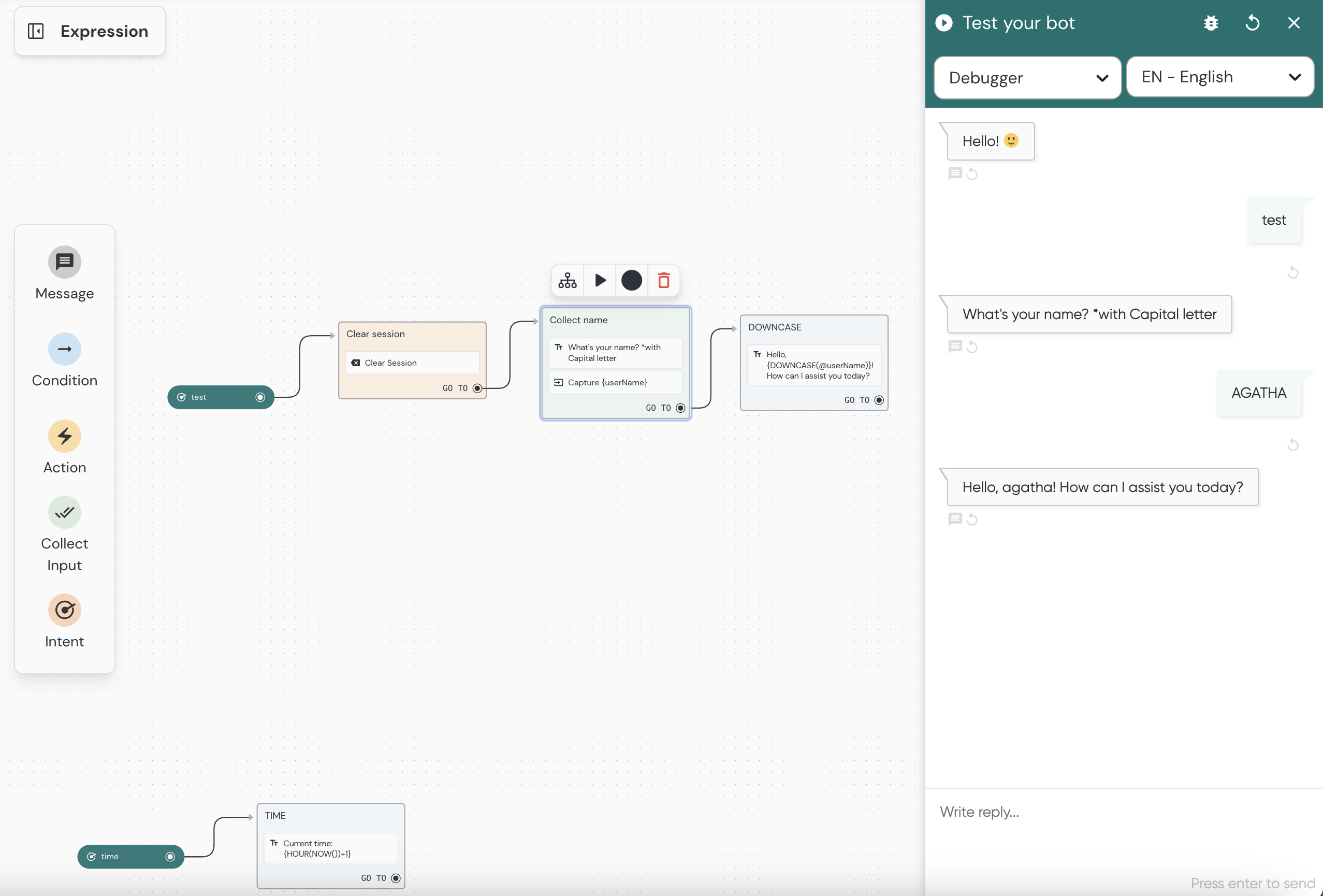 <figure><img src="https://181262846-files.gitbook.io/~/files/v0/b/gitbook-x-prod.appspot.com/o/spaces%2F-LLTwFwbOqJj4dDhg8Ju%2Fuploads%2FsKllhtWYvUxC0KZrqmHS%2FScreenshot%202024-01-23%20at%2015.32.04.png?alt=media&#x26;token=bada43ee-136f-4043-bb40-6b448d0d5240" alt=""><figcaption><p>Use a sintaxe de expressão para retornar a hora atual dentro de uma conversa.</p></figcaption></figure>