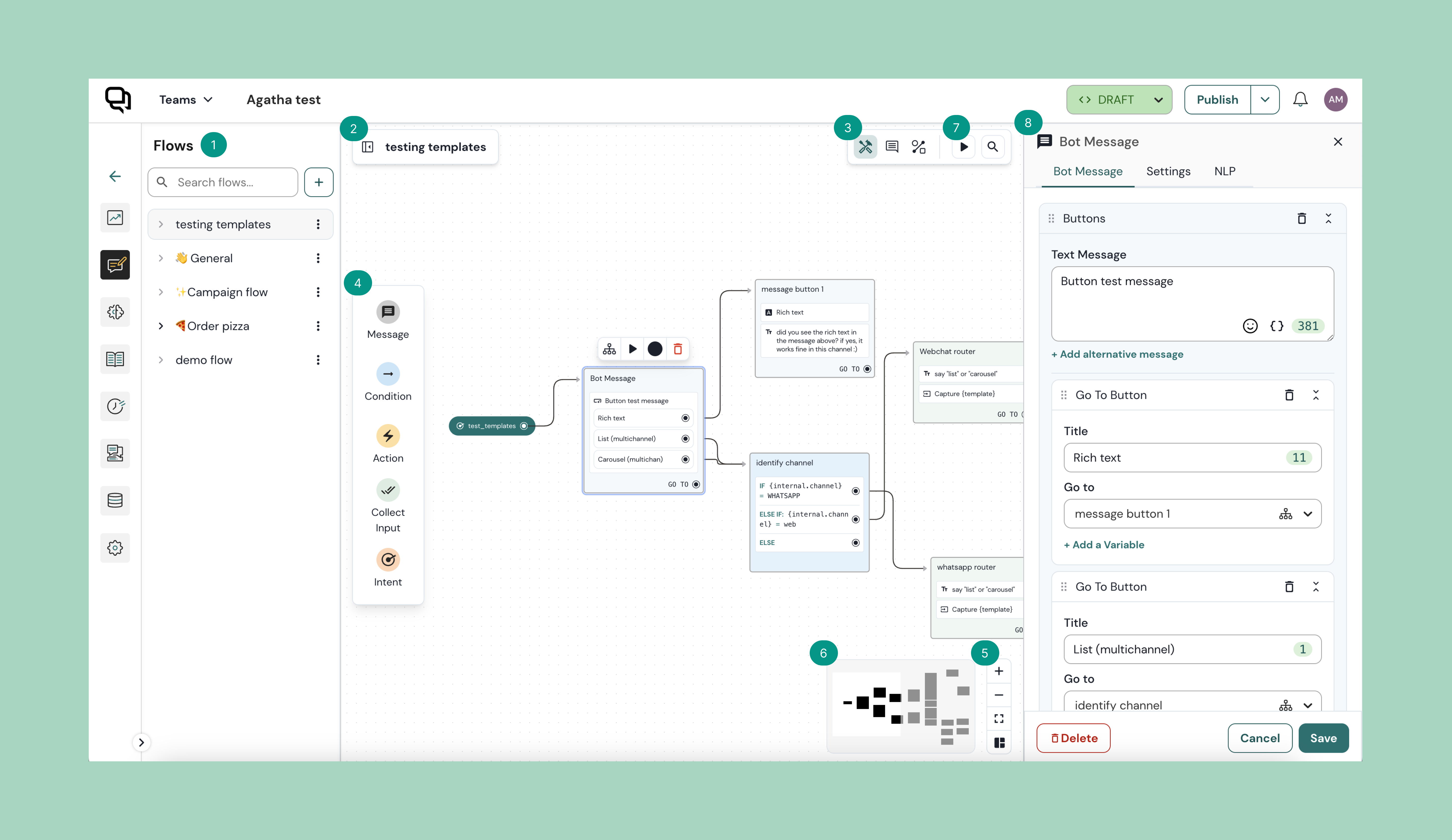 Construa o fluxo de conversa do seu bot sem esforço clicando e arrastando os blocos ou blocos de intenção desejados para a tela.