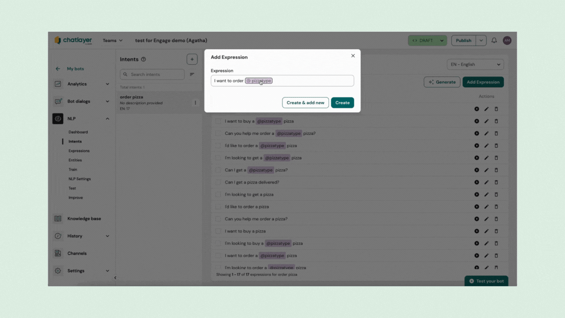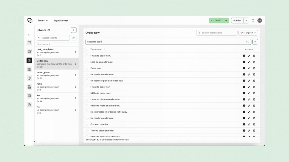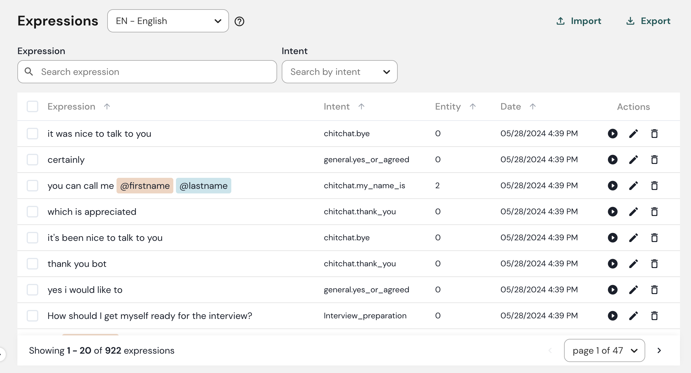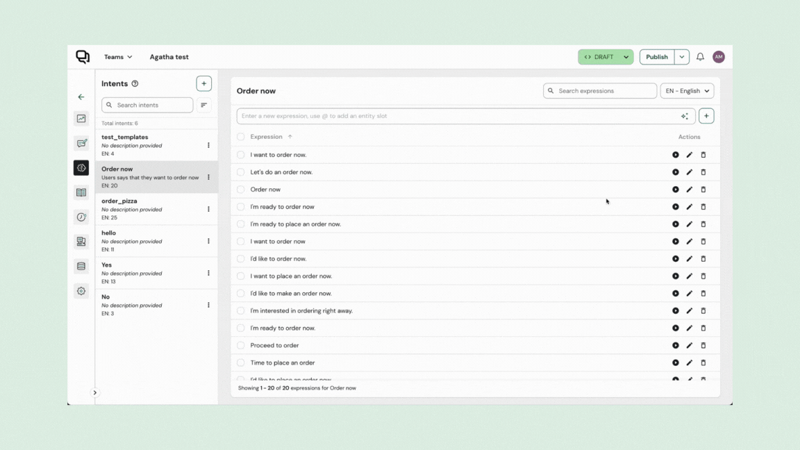 Sua aba Expressões é onde você pode ver todas as suas expressões e a qual intenção cada uma delas está rotulada.