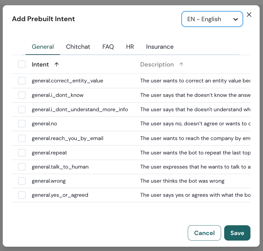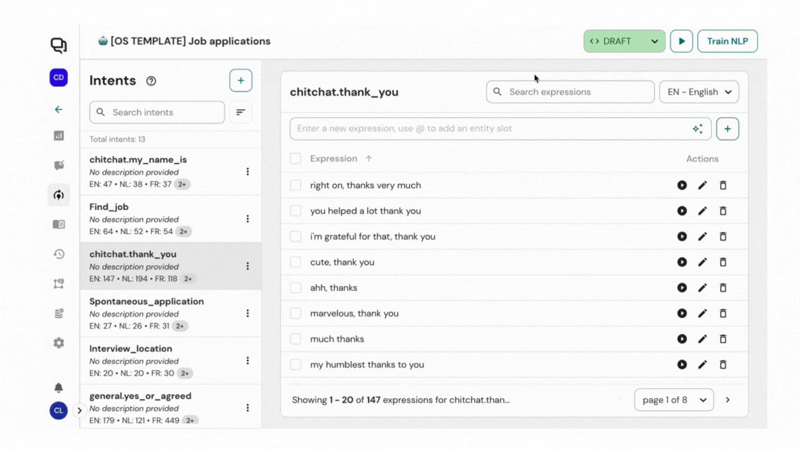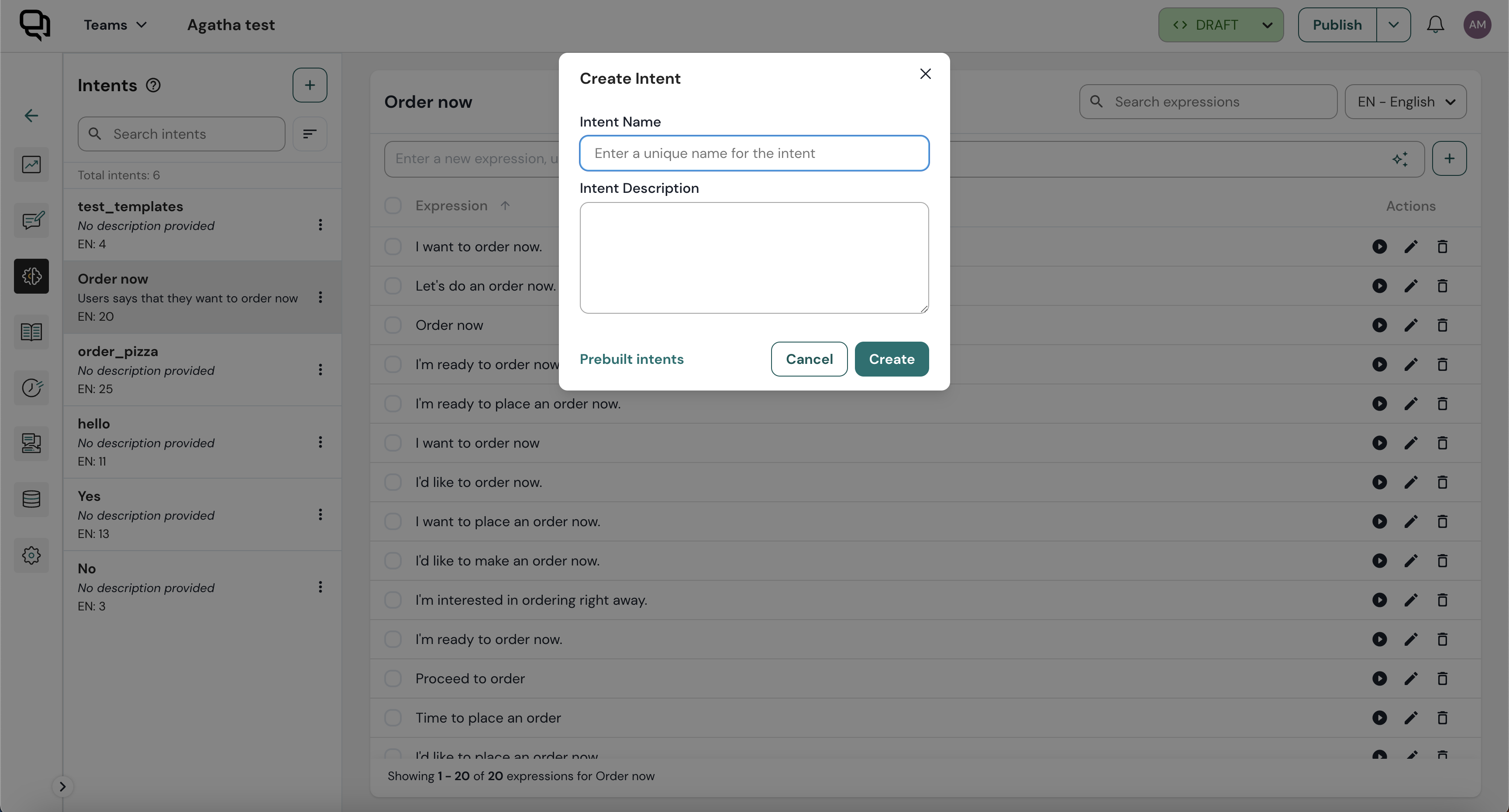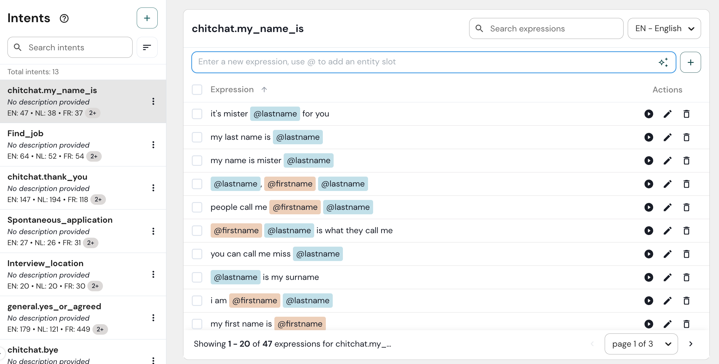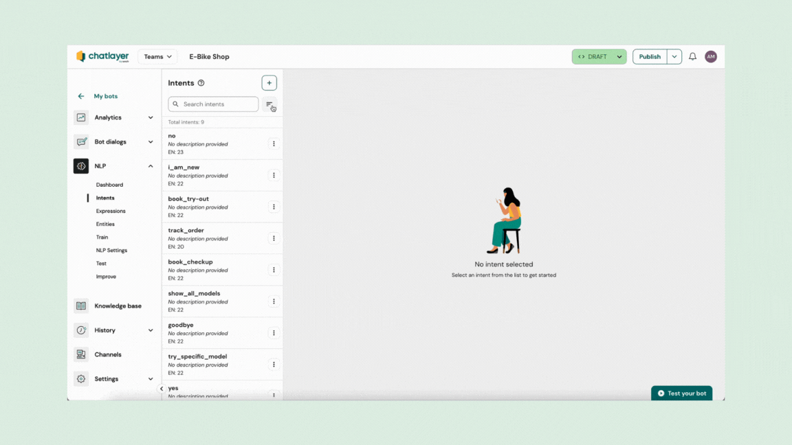 O Intents página é uma parte crucial da configuração do seu chatbot, permitindo que você aprimore seu entendimento de linguagem natural definindo intents.