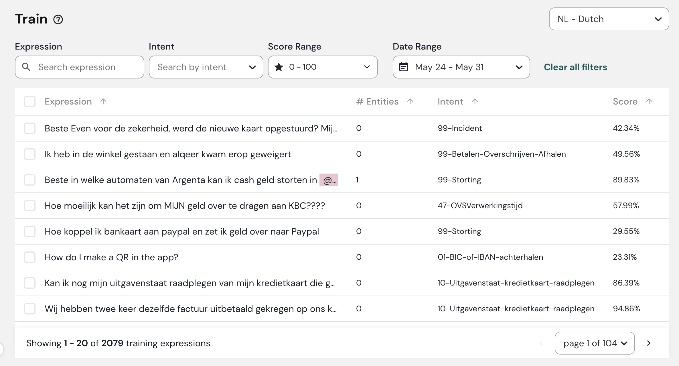 * No **Pontuação** coluna você verá a pontuação do modelo de PLN no momento em que a expressão foi dita. Isso pode diferir da pontuação que o modelo de PLN atual dá a essa expressão