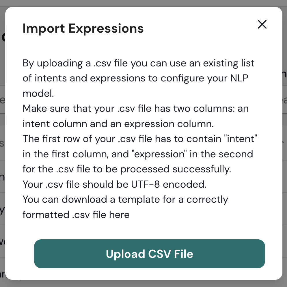 2. Certifique-se de ler o modal cuidadosamente para que você forneça um arquivo .csv com o formato apropriado.