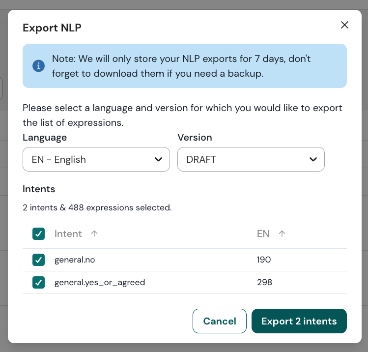 <figure><img src="https://181262846-files.gitbook.io/~/files/v0/b/gitbook-x-prod.appspot.com/o/spaces%2F-LLTwFwbOqJj4dDhg8Ju%2Fuploads%2FhgtVaGJ7JehAYsbgsLRa%2FScreenshot%202024-08-27%20at%2014.30.48.png?alt=media&#x26;token=818603d6-153e-4a2f-bc8c-773cba9b8075" alt="" width="375"><figcaption><p>Exportar intents.</p></figcaption></figure>