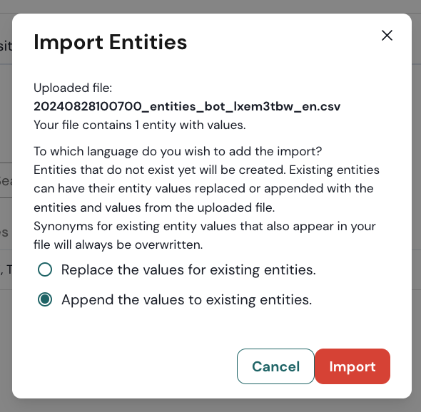 3. Um modal aparece. Leia-o cuidadosamente antes de escolher substituir as entidades atuais ou anexar suas entidades às atuais.&#x20;