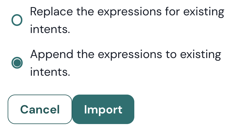 5. Leia o modal cuidadosamente antes de escolher se deseja adicionar ou sobrescrever seus intents atuais. Selecione o botão de opção correspondente.