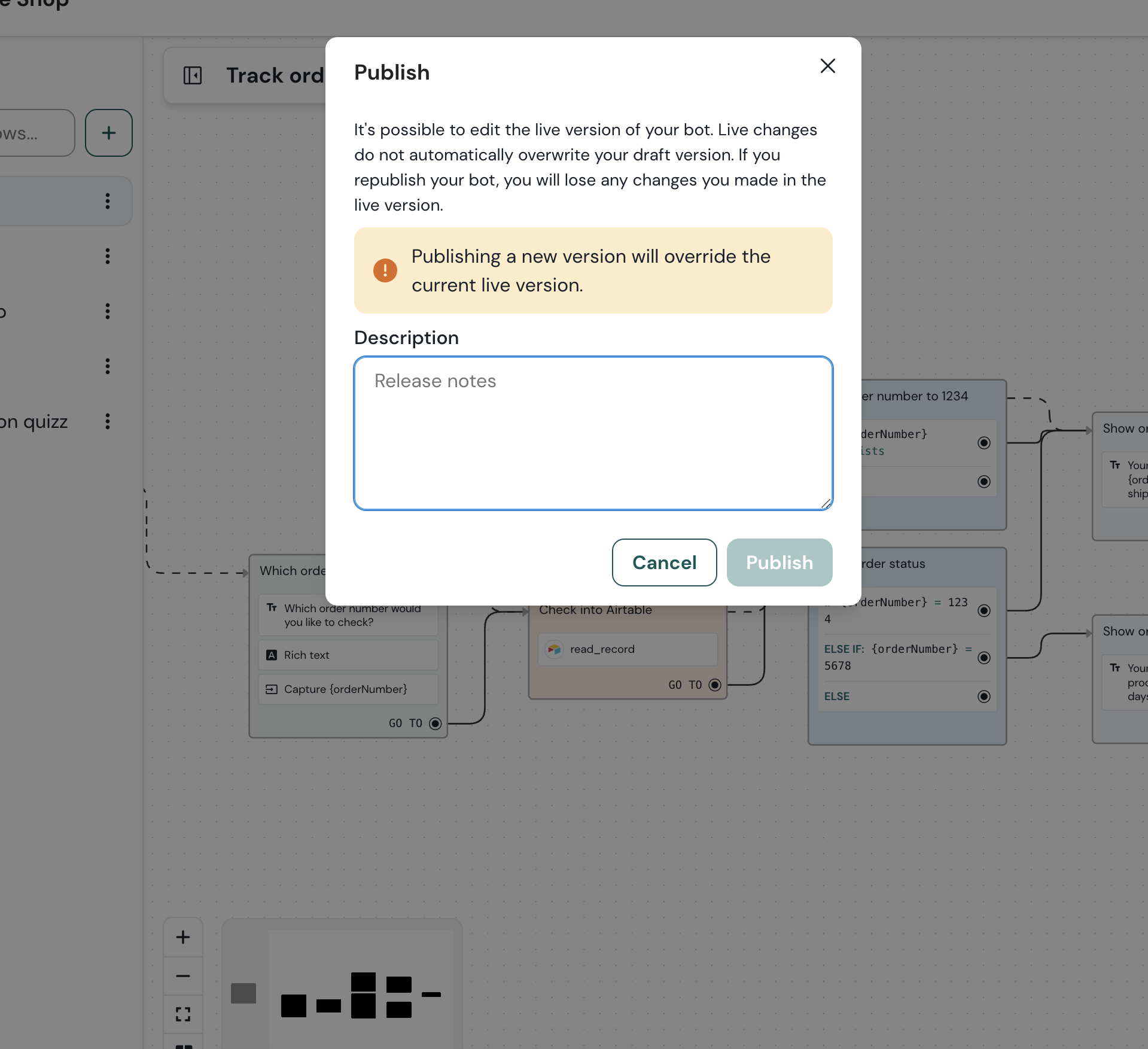 Uma vez que seu bot esteja ao vivo e os usuários estejam conversando com ele, você pode continuar fazendo alterações no seu bot na versão RASCUNHO. Quando suas alterações estiverem finais, você pode publicar uma nova versão AO VIVO do seu bot. A versão existente do seu bot AO VIVO será então substituída pela sua versão RASCUNHO atual.
