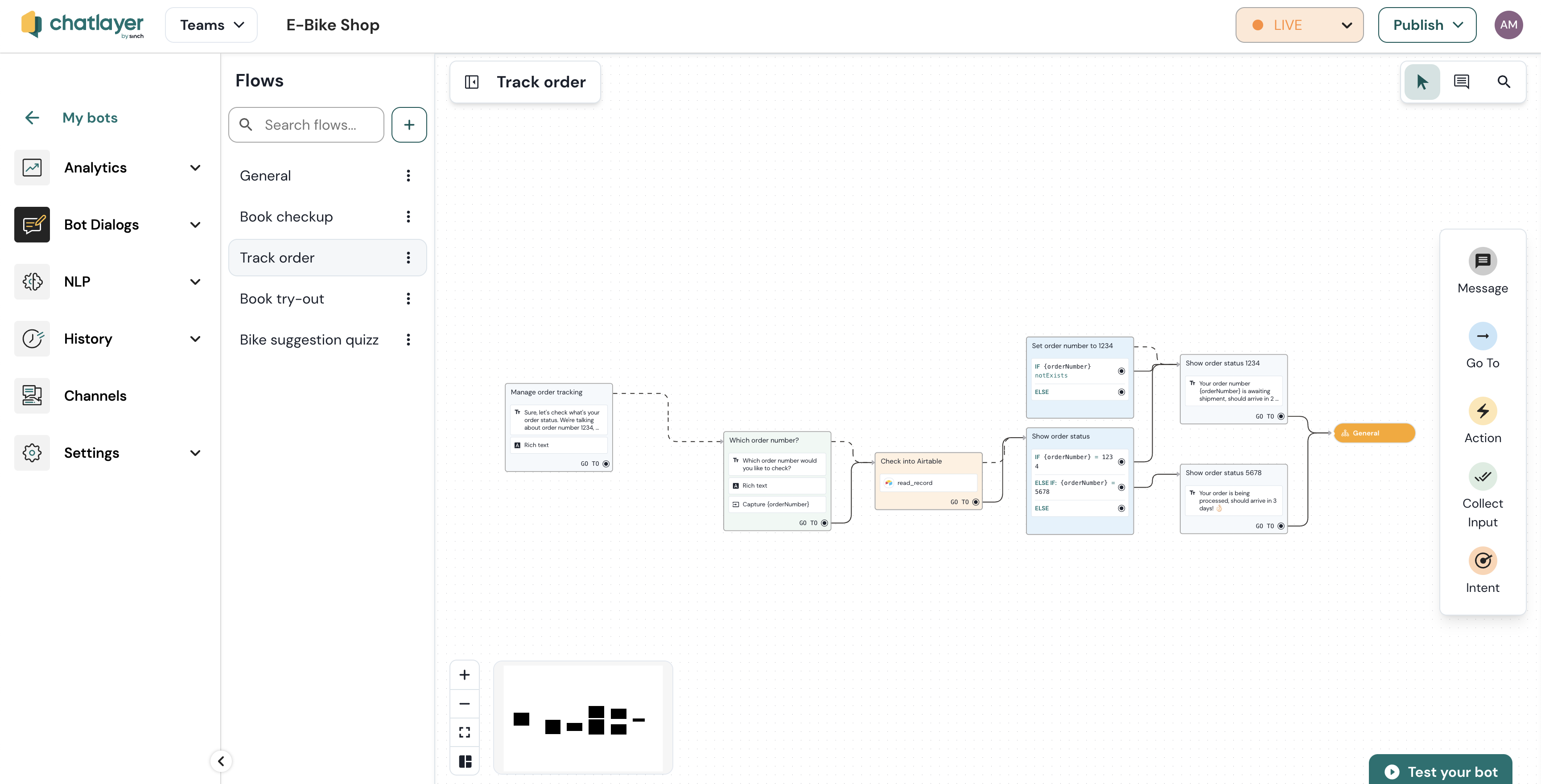 Alternar para a versão ao vivo proporciona acesso imediato à versão mais recente do seu bot, incluindo todos os fluxos que você acabou de publicar. Essa será a versão com a qual os usuários do seu bot irão interagir, e quaisquer alterações feitas nela terão impacto imediato.