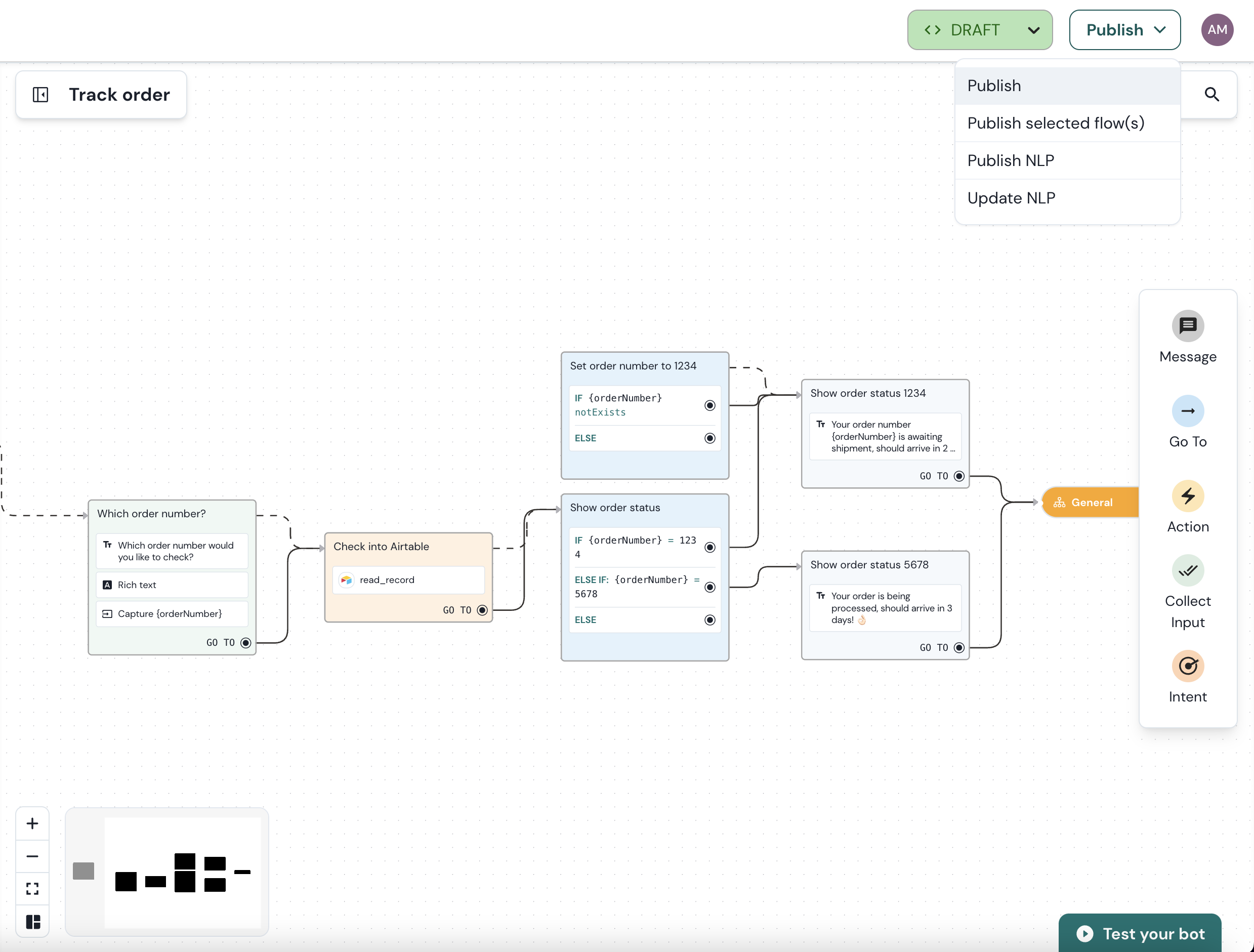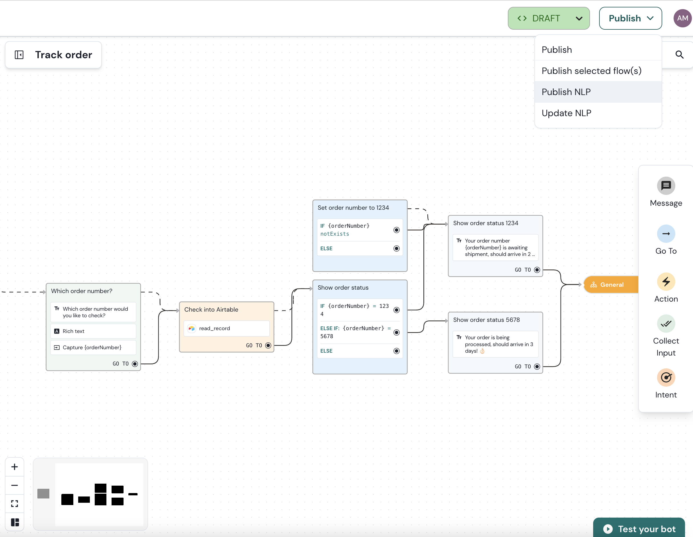 Publicar seu modelo de NLP nunca foi tão fácil. Simplesmente clique no botão 'Publicar' e selecione 'Publicar NLP' para tornar seu modelo de NLP ao vivo.