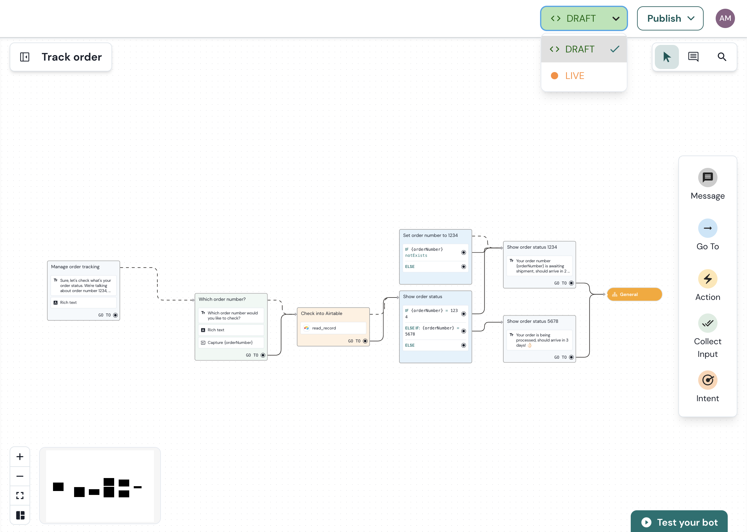 Para garantir desempenho ideal, sempre publique seu bot e conecte seus canais voltados ao cliente à versão Ao Vivo do seu chatbot ou voicebot. Use sua versão RASCUNHO e canais para iterações e testes antes de publicar uma nova versão AO VIVO.