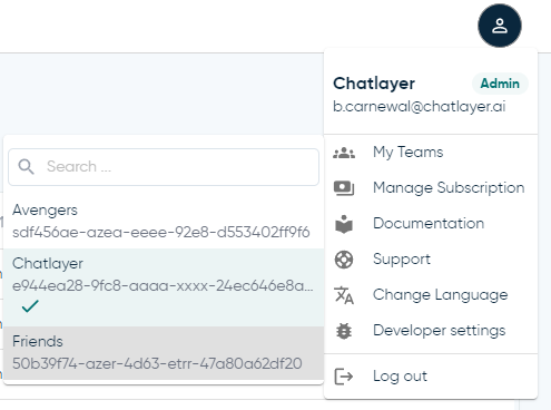 Quando você adiciona um novo usuário à sua equipe, ele receberá um e-mail de ativação para ativar sua nova equipe do Chatlayer. Usuários que já possuem uma conta e pertencem a outra equipe do Chatlayer poderão alternar entre equipes usando o ícone no canto superior direito na plataforma.