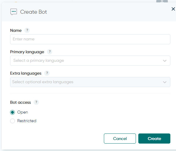 Bots podem ser definidos como ABERTOS ou RESTRITOS. Um bot ABERTO pode ser acessado por todos os membros da equipe. Bots RESTRITOS só podem ser acessados por Administradores e Membros aprovados.