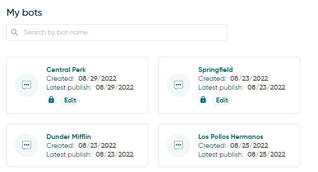 Seu nível de acesso a um bot pode ser visto na página de visão geral "Meus Bots". Bots restritos terão um ícone de cadeado e, nessa mesma linha, você poderá ler seu tipo de permissão para ele: