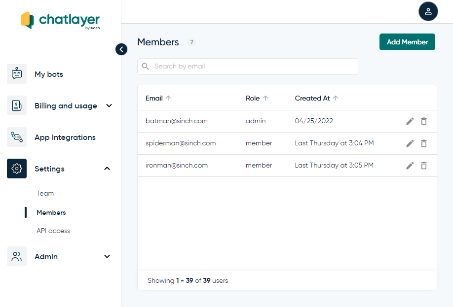 Um usuário pode ser administrador ou membro da equipe. Isso pode ser alterado pressionando o lápis no **Configurações > Membros** módulo.