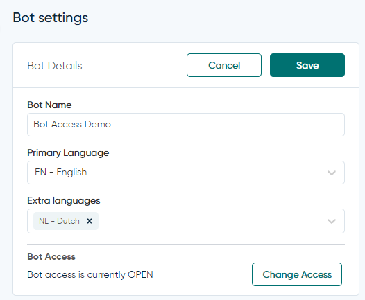 Você pode alterar a configuração de Acesso ao Bot para um bot existente selecionando "Alterar Acesso" em **Bot > Configurações > Configurações do Bot** módulo: