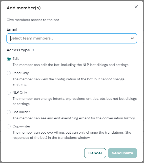 * **Somente NLP:** o membro pode alterar intenções, expressões, entidades, etc., mas não blocos ou configurações.