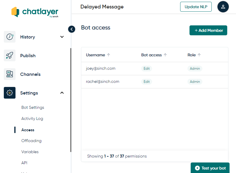 A Chatlayer.ai possui um sistema de acesso baseado em funções que permite restringir bots específicos para usuários específicos e conceder direitos específicos por bot.