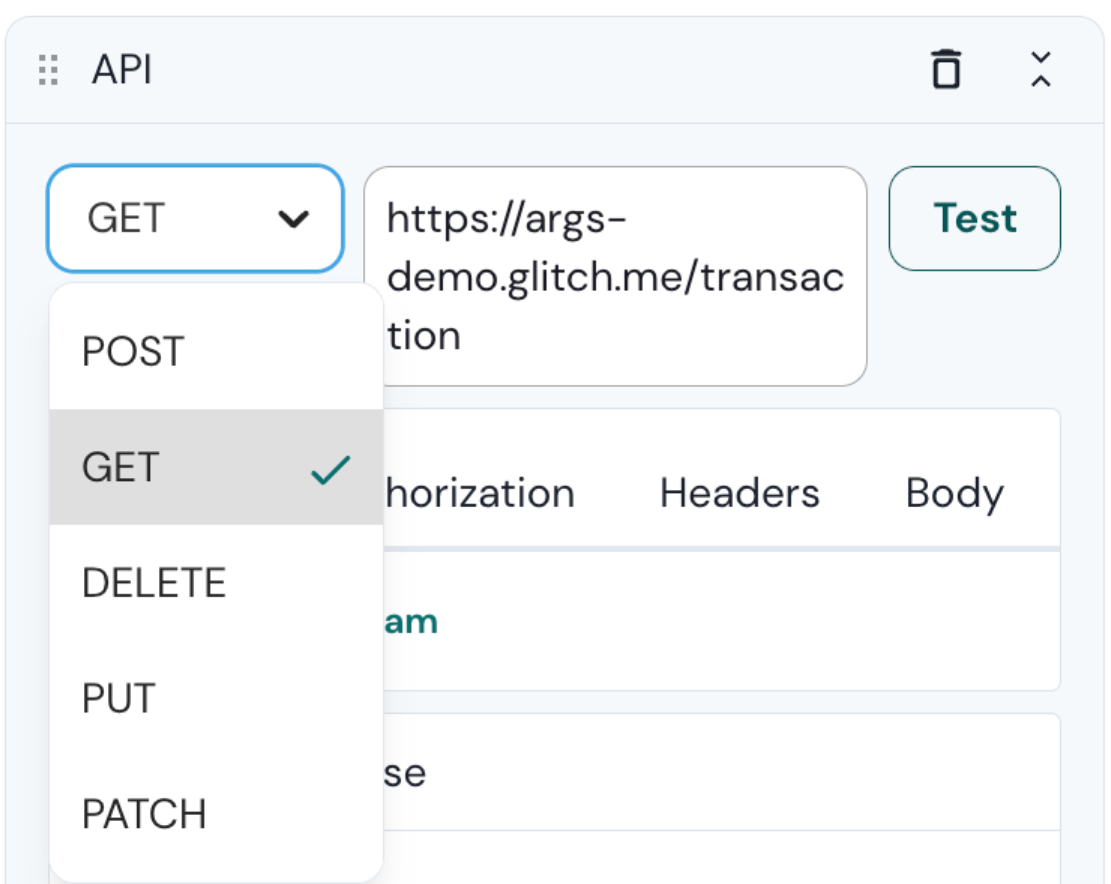 The API step supports 5 HTTPS methods: