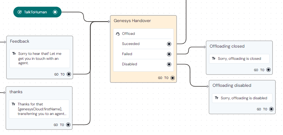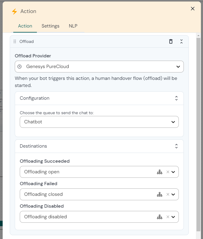 Once a user reaches this part of the conversation, the offload towards Genesys Cloud will be triggered. The bot will automatically be paused when a user reaches this action. When the agent closes the conversation, the bot will be resumed.
