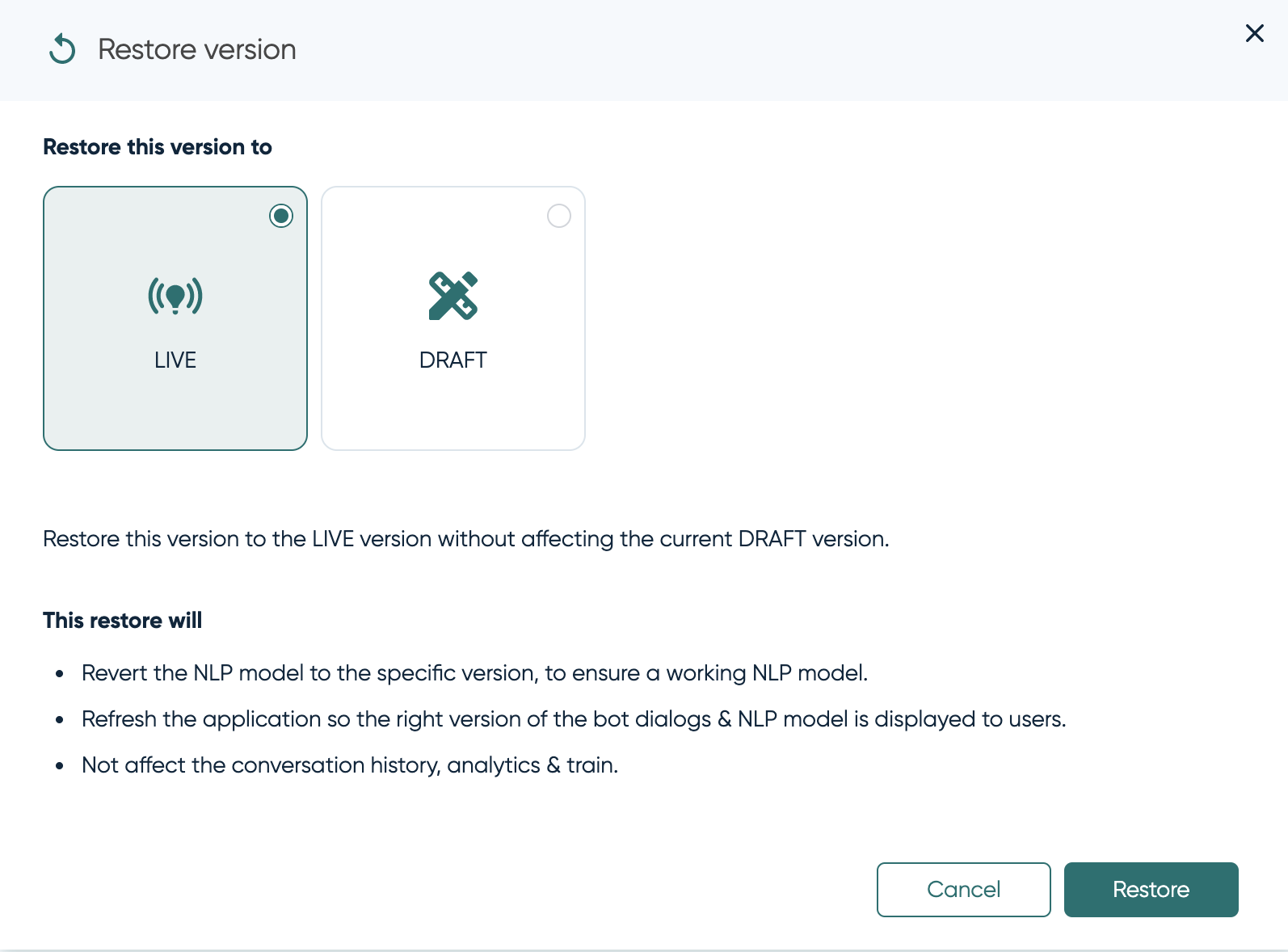Restoring a version to DRAFT means overwriting your current DRAFT version. This cannot be undone.