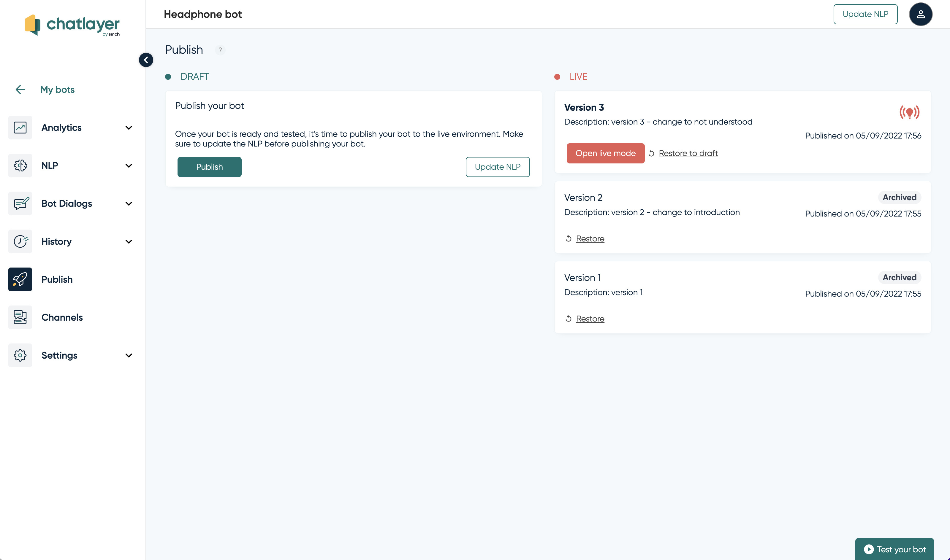 Need a refresher on what versions are and how they're used? Read more [here](https://docs.chatlayer.ai/publish/publishing-your-bot).