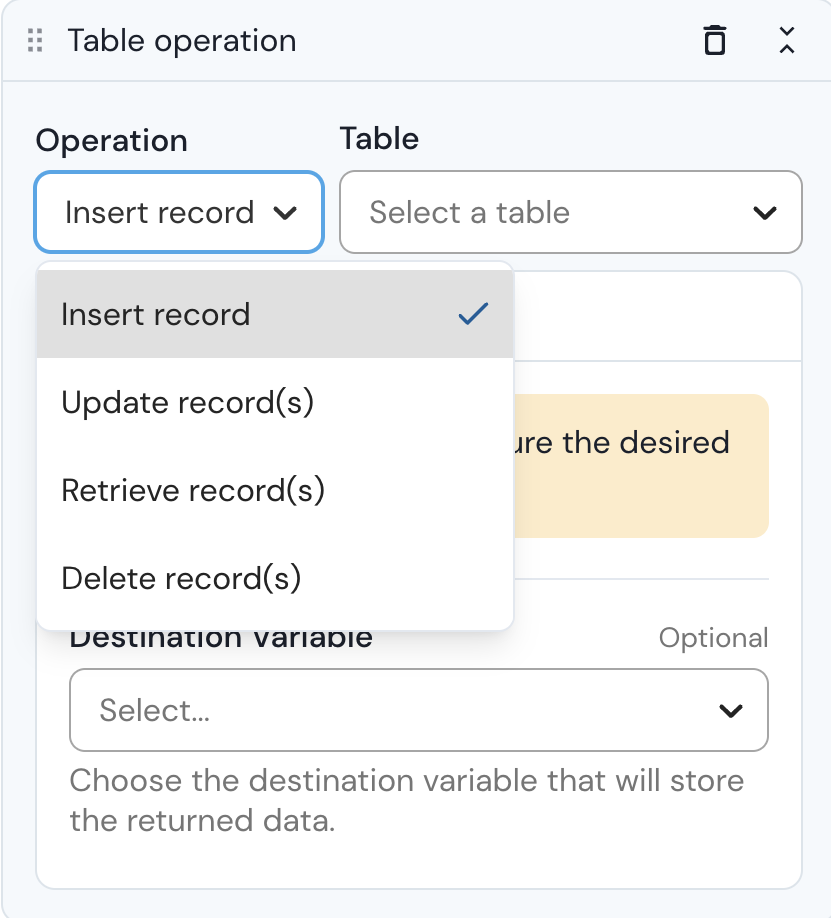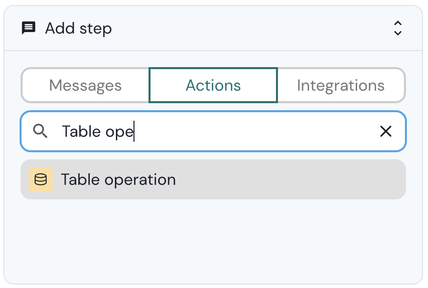 <figure><img src="https://2786867680-files.gitbook.io/~/files/v0/b/gitbook-x-prod.appspot.com/o/spaces%2F-LLTwFwbOqJj4dDhg8Ju%2Fuploads%2F0TBl2qfc3A94J0I2kE8v%2FScreenshot%202024-03-13%20at%2018.22.18.png?alt=media&#x26;token=c562b25e-b1aa-41e3-bf77-57223d2dcbdc" alt="" width="375"><figcaption><p>Table operation inside of Action step</p></figcaption></figure>