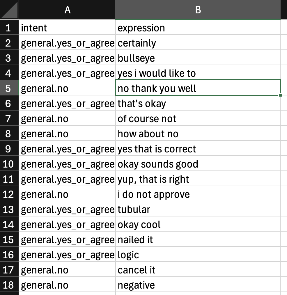 <figure><img src="https://2786867680-files.gitbook.io/~/files/v0/b/gitbook-x-prod.appspot.com/o/spaces%2F-LLTwFwbOqJj4dDhg8Ju%2Fuploads%2FCFuHLGLgTb5oJ8sTi4Ht%2FScreenshot%202024-08-27%20at%2014.34.50.png?alt=media&#x26;token=910f9bfb-4f74-4d5b-accb-98ba7807bf82" alt="" width="375"><figcaption><p>Open your intents export as a .csv file.</p></figcaption></figure>