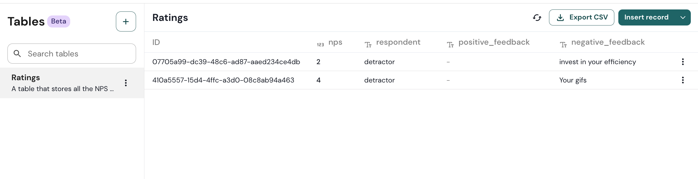 <figure><img src="https://2786867680-files.gitbook.io/~/files/v0/b/gitbook-x-prod.appspot.com/o/spaces%2F-LLTwFwbOqJj4dDhg8Ju%2Fuploads%2FRr6pebM4xk8YO1SpPliS%2FScreenshot%202024-05-30%20at%2015.57.04.png?alt=media&#x26;token=91d50373-9e76-4b09-8dd2-f9b7712d73a7" alt=""><figcaption><p>The Table to store NPS ratings.</p></figcaption></figure>