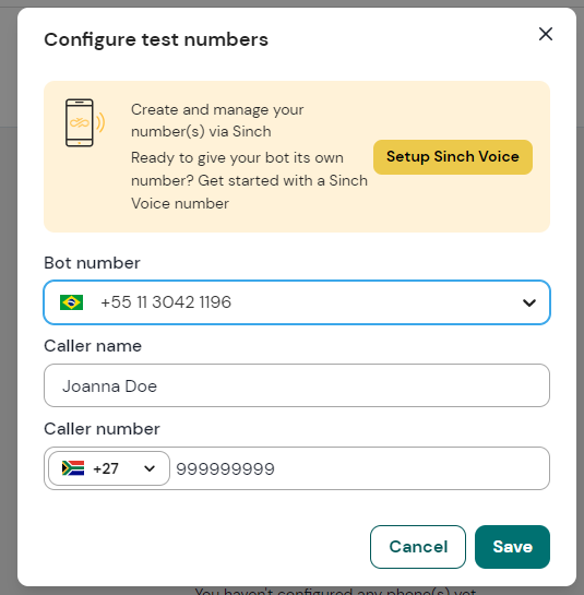 To test your bot, add a Voice channel and go to the Test numbers tab.